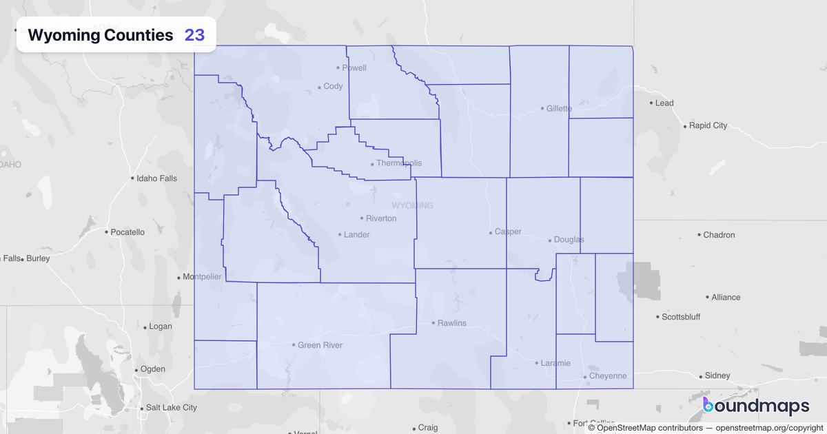 Albany CountyBig Horn CountyCampbell CountyCarbon CountyConverse CountyCrook CountyFremont CountyGoshen CountyHot Springs CountyJohnson CountyLaramie CountyLincoln CountyNatrona CountyNiobrara CountyPark CountyPlatte CountySheridan CountySublette CountySweetwater CountyTeton CountyUinta CountyWashakie CountyWeston County